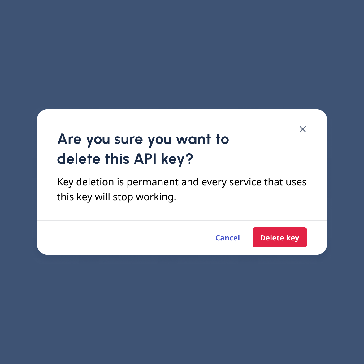 We recommend always putting the trigger of dangerous actions under a confirmation modal. With that said, when talking about dangerous action buttons, we should never use a generic label like “Ok” or “Continue” since users are used to seeing them and might just click them by intuition, instead, we recommend always putting the verb/action at the forefront, for example, if the action is going to delete a key, the label should be “Delete key”.