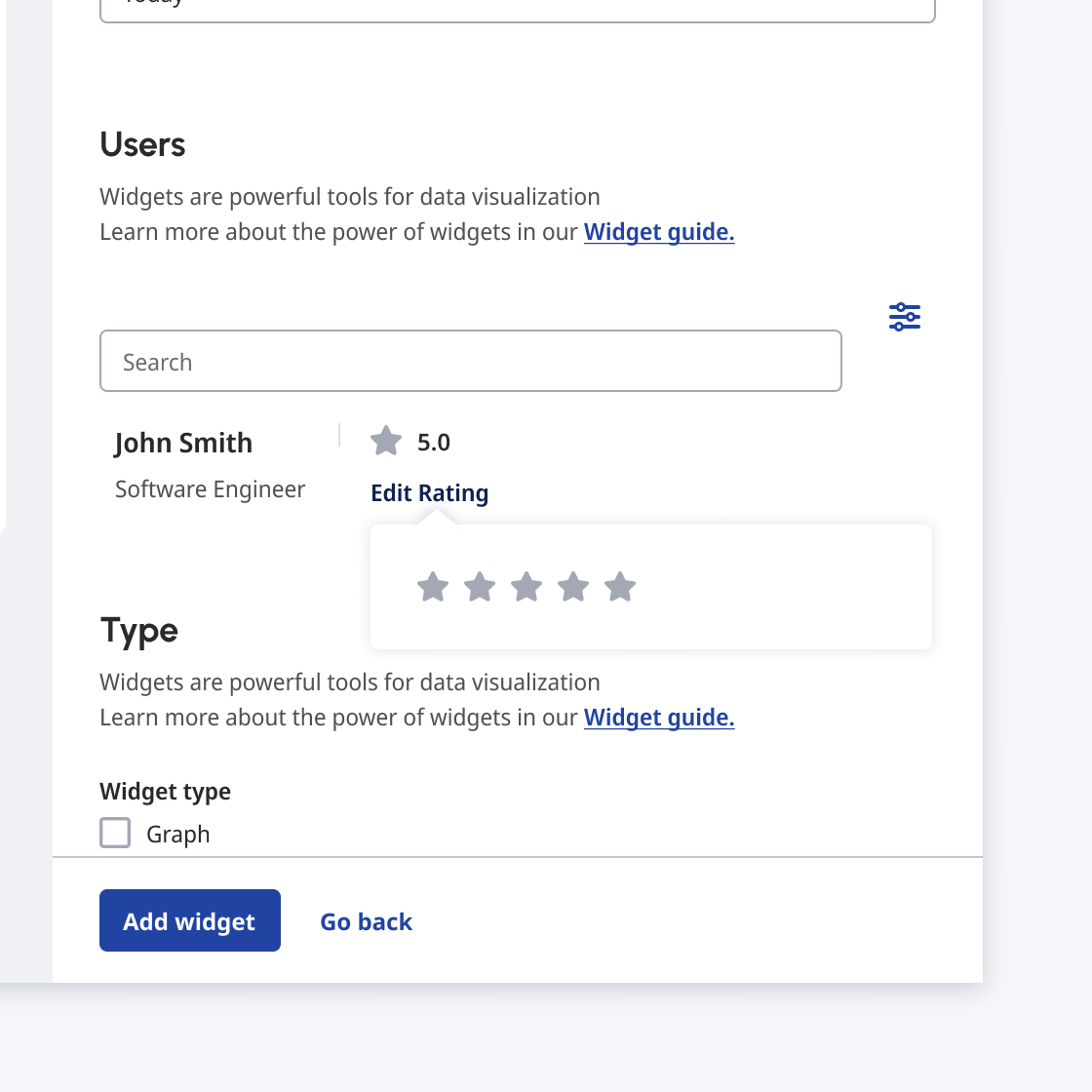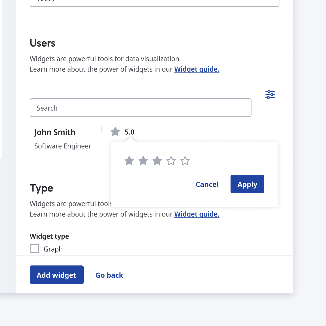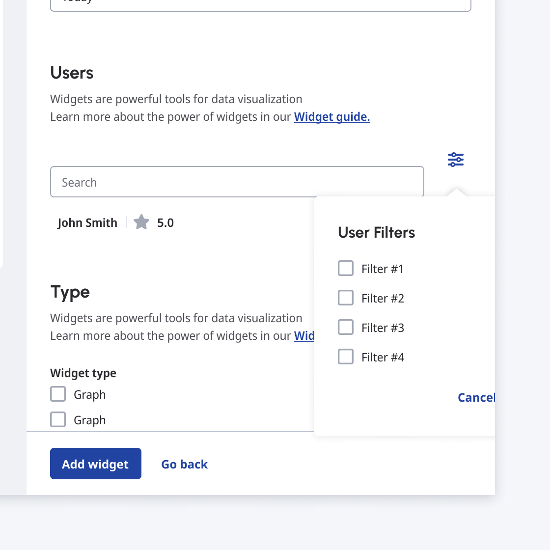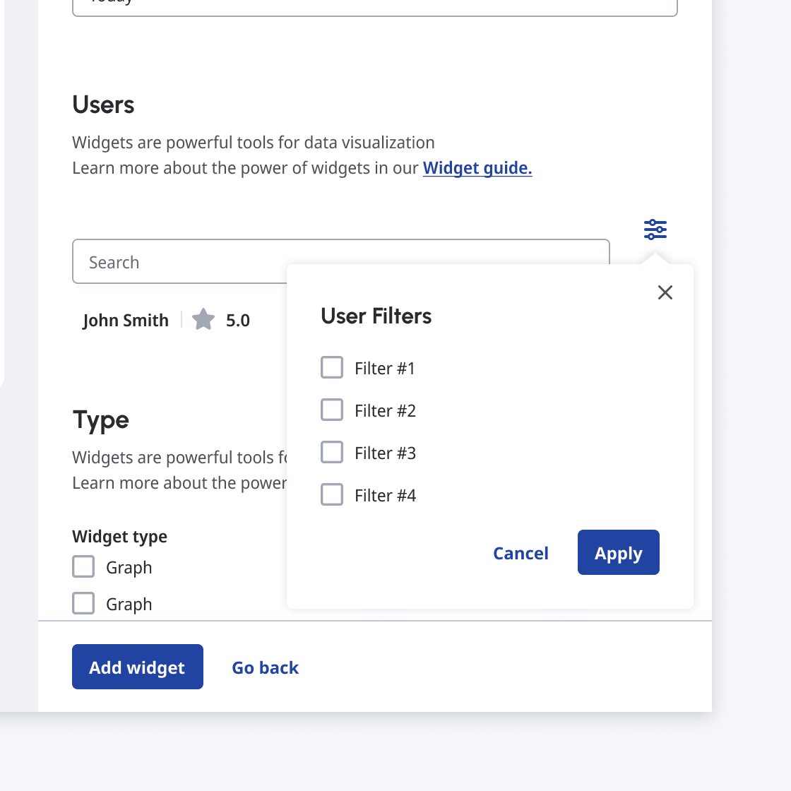 The CTA group nested within the popover component is optional. When a popover is placed within a form field, designers may make use of this optional toggle, given that the submit/confirmation action is performed at the form level.