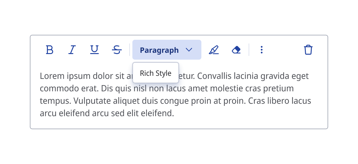 In the below examples the slot is replaced by the RTE Rich Style List and the RTE Color Palette base components.