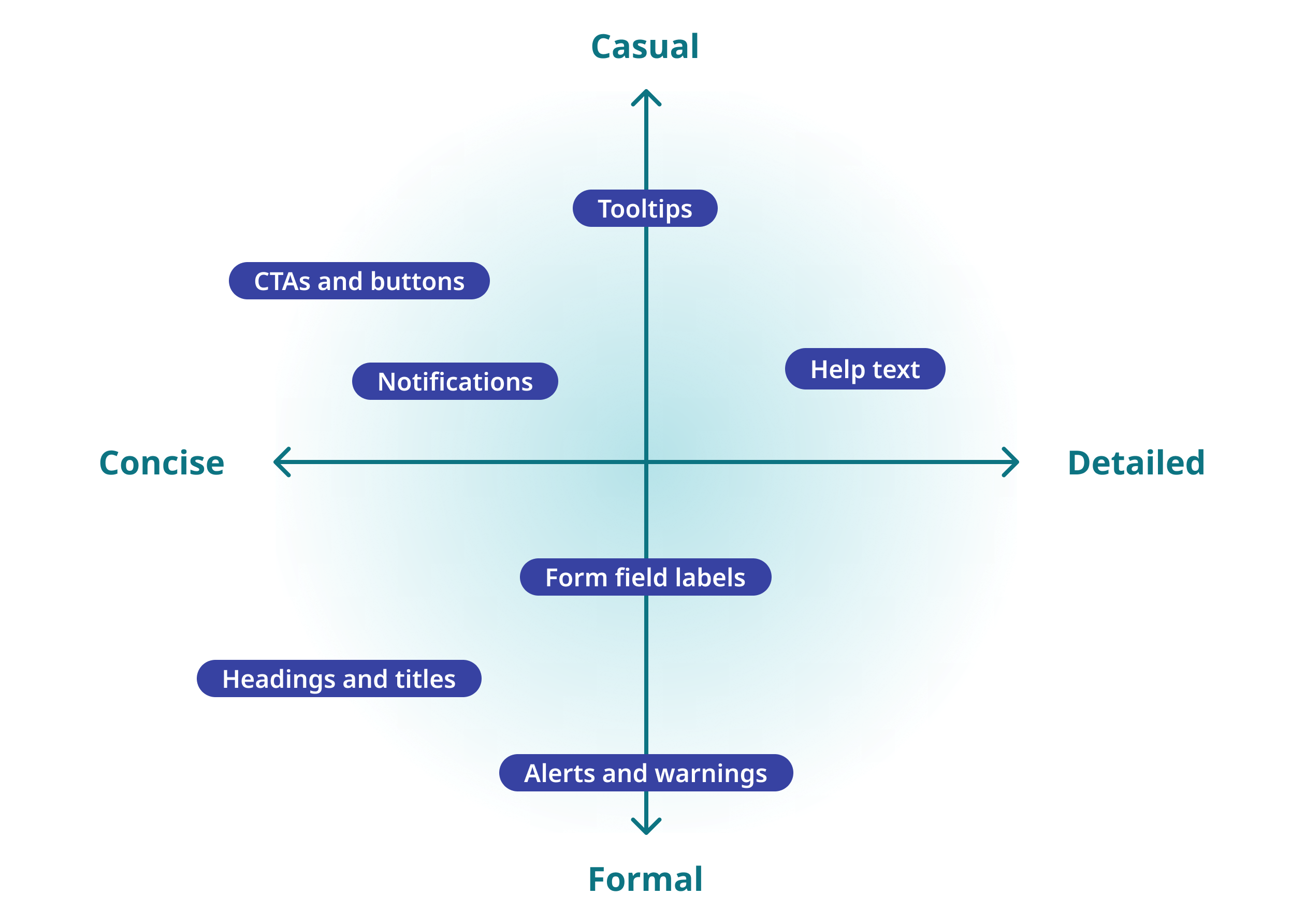 This grid can help you identify what tone to use based on the copy your are writing. Generally, we are casual and concise, but there will be times when a more formal and detailed approach is better for providing information to the user.