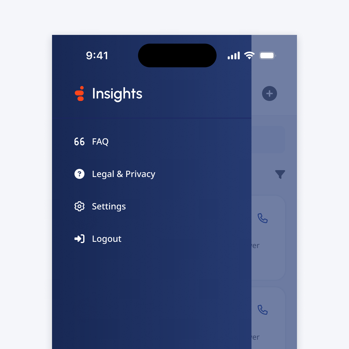 The side menu view is the third part of our mobile navigation structure. This view should be used for three types of items: user profiles, settings tabs and additional items (non-crucial navigation items).